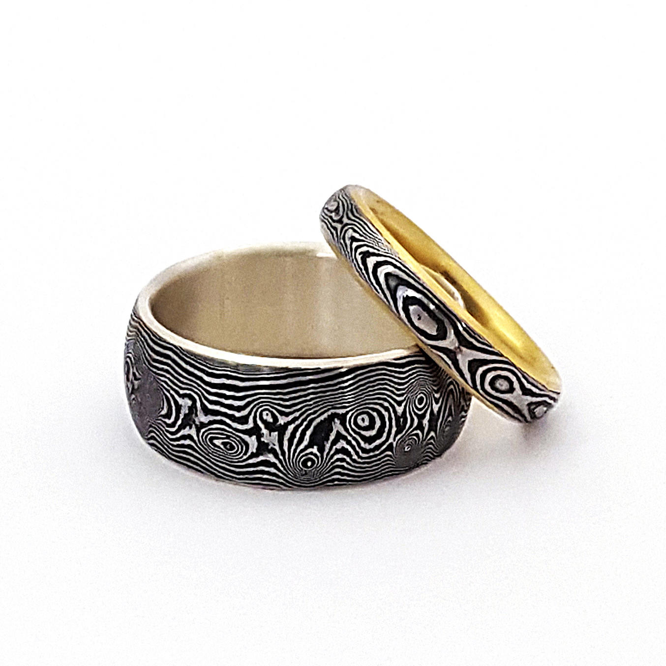 Lyle Poulin, of HANDFORGE, create traditionally made Damascus Steel rings to your specifications. Different widths, patterns and liner material create your unique "fingerprint" of a ring. Call for your free consultation and price quote.